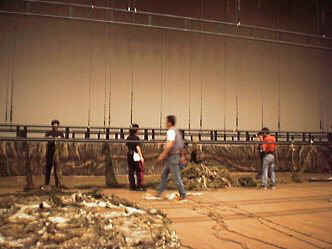 | 照明の吊り込み: 舞台上方には、照明機材やセット、看板を吊るための鉄のパイプ、‘バトン’があり、 舞台手前から奥までの間に、数本から数十本が(奥行により異なる)、平行に並んでいます。 その中から指定の位置のバトンを下ろし、まず、照明機材の吊り込みが行われます。 写真左が通常のライトの、写真右がムービング・ライトのそれぞれの吊り込みのもようです。 バトンを下ろすのは、安全のため、舞台上にまだ何も運び込まれていないときに行います。 電源コードや、舞台上にセットされたライトなどがありますから、足元には注意してください。 |