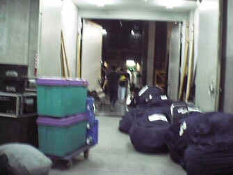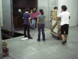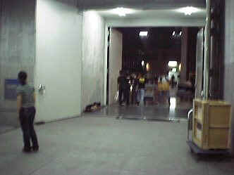 | 搬入: 「おはようございま〜す」という、スタッフの皆さんの元気のいい声で一日が始まります。 舞台の搬入口が開けられ、使用される大道具、小道具類が楽屋や舞台袖に運び込まれます。 |