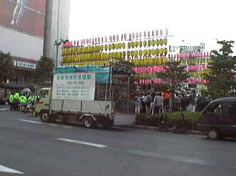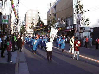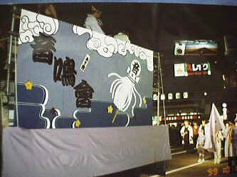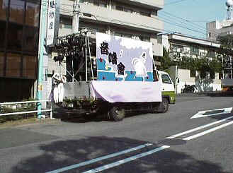 ![]() お祭りは二部構成で、パレードは二部のエンディングに行われます。 駅前の特設ステージでは、一部の演目(演技と演奏)が行われているところです。 手前のトラックは、今は、その拡声器として使われていますが、 二部のパレードでは、地方車の1台に早変わりします。