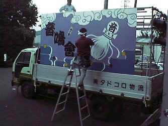 ![]() トラックの飾り付けは当日に行われるのですが、 この時点で、試しに飾り付けをしてみる人もいます。